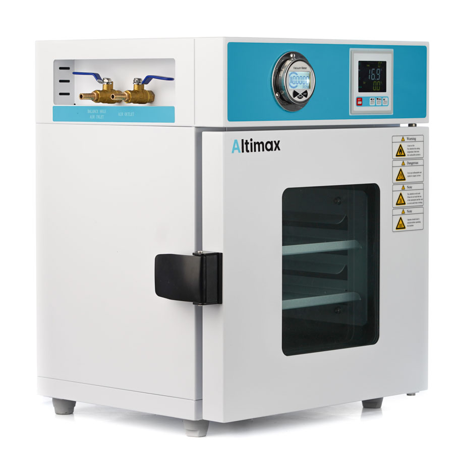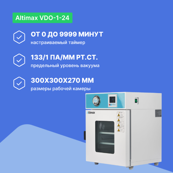 Altimax VDO-1-24 — это сушильный вакуумный шкаф объёмом 24 литра, предназначенный для сушки различных материалов при температуре до 250 °C. Он оснащён аналоговым вакуумметром класса точности 2,5 и позволяет создавать вакуум до 133 Па. Время сушки может быть установлено от 0 до 9999 минут. Шкаф изготовлен из нержавеющей стали и имеет компактные размеры. Управление осуществляется с помощью цифровой панели, расположенной над дверцей.