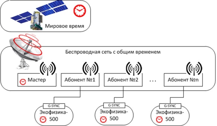 Измерительные модули Экофизика-500 подключаются к абонентам сети общего времени по кабелю через порт G-Sync и получают стробы и отметки времени. Благодаря этому результаты измерений, полученные разными измерительными модулями, могут быть синхронизованы по времени с помощью математической обработки на  компьютере.