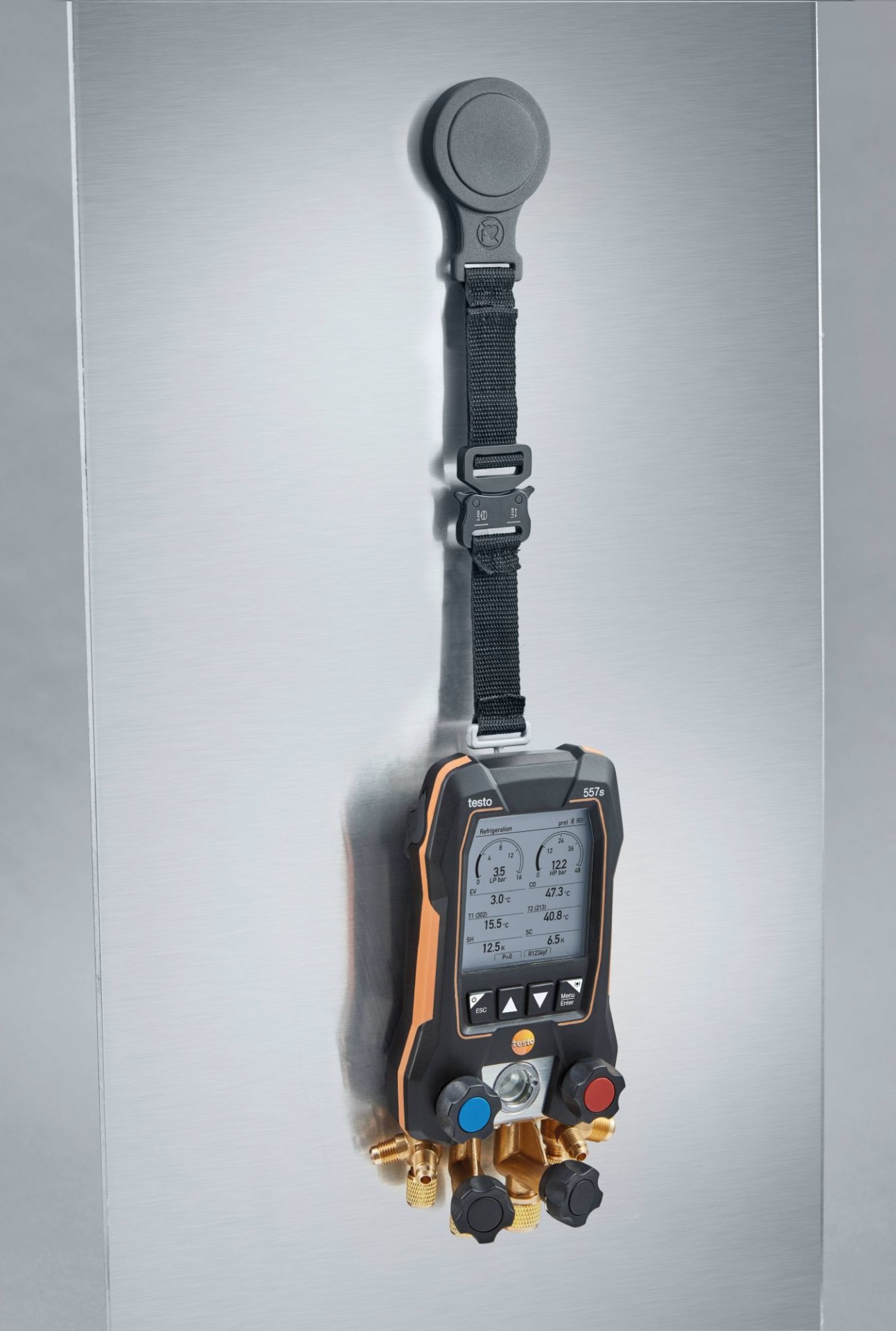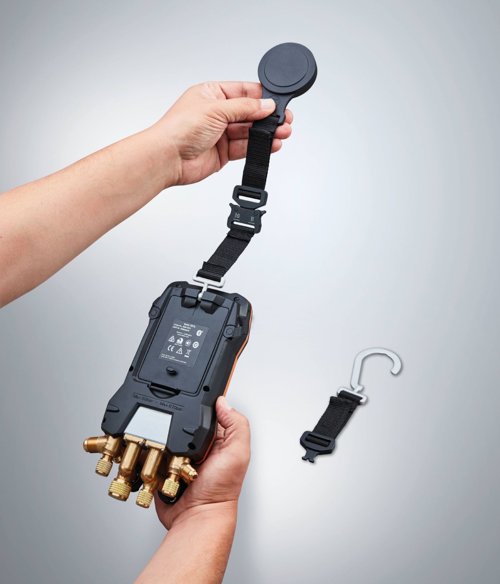 Используйте магнитный ремень, чтобы быстро и надёжно закрепить ваш манометрический коллектор на металлических поверхностях холодильных систем, систем кондиционирования и тепловых насосов. Благодаря простой системе защёлкивания вы можете либо подвешивать прибор на крюк, либо закреплять его с помощью магнита – и ваши руки будут свободны для измерений.