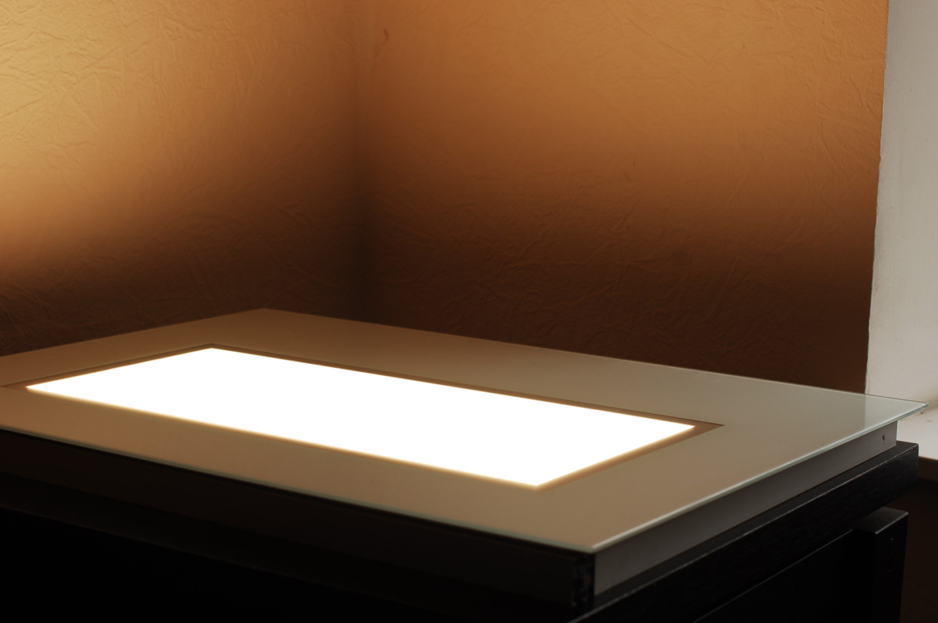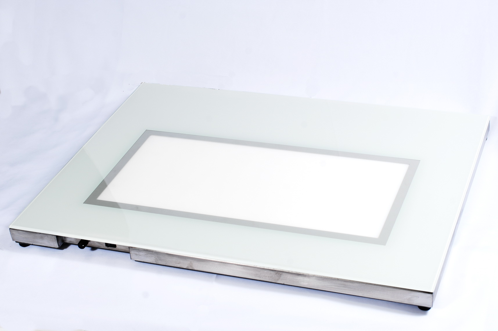 Накладка на стол изготовлена из закаленного стекла, снабжена светодиодной подсветкой с плавной регулировкой яркости. Минеральное стекло, из которого выполнена рабочая поверхность и отсутствие рамок или буртика по краю позволяет быстро осуществлять очистку изделия. Рама изделия изготавливается из нержавеющей стали. Небольшая толщина накладки и ее брызгозащищенное исполнение позволяют располагать его на имеющихся столах или лабораторной мебели. Также эти особенности предлагаемого изделия позволяют компактно хранить его в промежутках между исследованиями. При наличии места для стационарного размещения в виде специализированного столика возможно изготовление стационарного основания (указывается при заказе). Яркость подсветки устанавливается опытным путем. Толщина ломтиков просматриваемого на просвет филе, с которого предварительно удалена кожа, зависит от степени его просвечиваемости и также устанавливается опытным путём. Как правило, она не должна превышать 3 см.