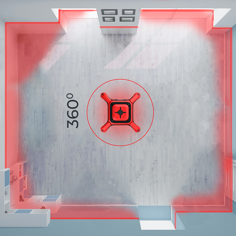 - Лазер проецирует горизонтальную плоскость на 360º, а также точки зенит и надир . Чтобы построить вертикальную плоскость, достаточно повернуть прибор на бок.