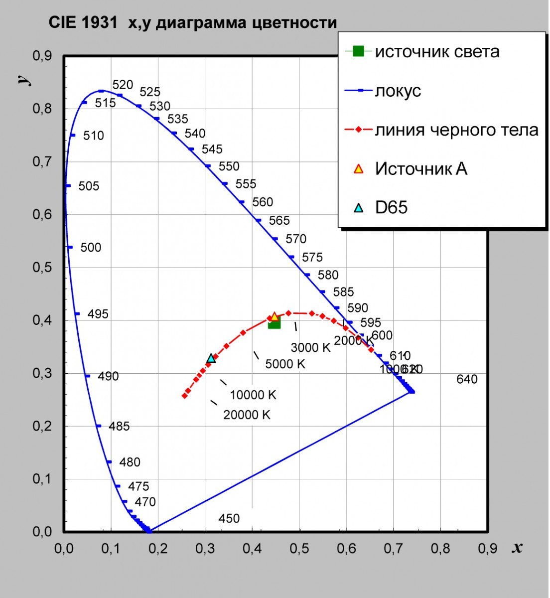 1 Отображение яркости L, кд/ми координат цветности (x, y) в системе МКО 31