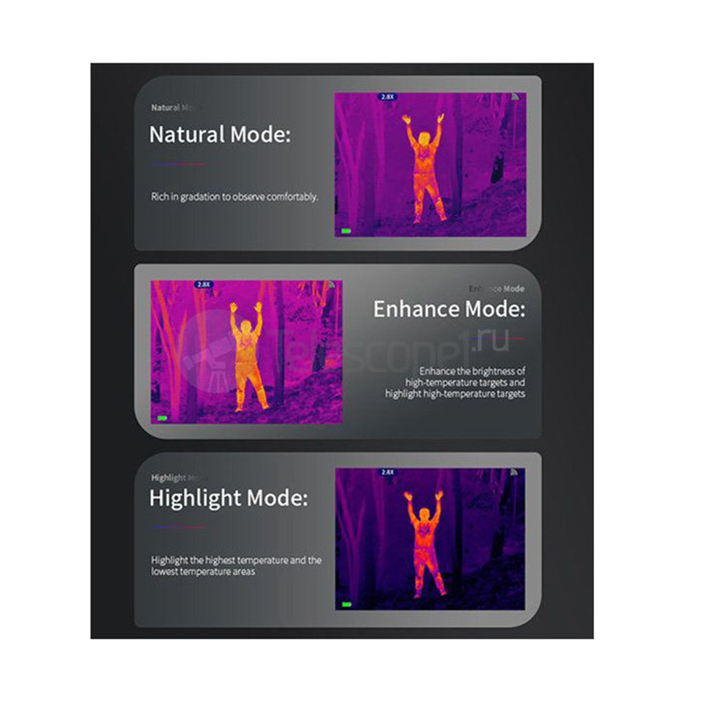Микродисплей LSOC в окуляре отличается большим разрешением 1280×960, высокой чёткостью и хорошей контрастностью (особенно в ночное время), а само изображение воспринимается глазом так же, как картинка на 22-дюймовом экране с расстояния в метр. Для каждого наблюдения можно добиться оптимального качества картинки благодаря 5 цветовым палитрам и 3 режимам наблюдения с индивидуальной регулировкой контраста и яркости.