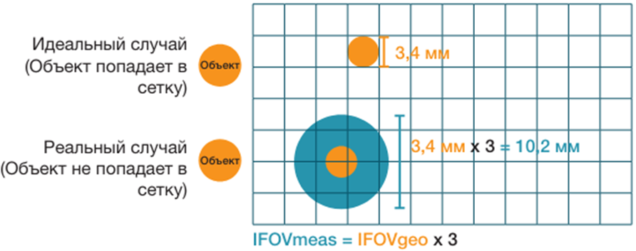 Однако параметр IFOVgeo — лишь теоретическая величина. Измеряемый объект в действительности не укладывается в решётку, определяемую разрешением тепловизора. Поэтому существует такой параметр, как IFOVmeas.