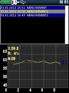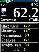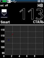— большой цветной графический дисплей. Помимо имеющихся 88 комбинаций шкал твердости и материалов (калибровок), прибор дает возможность дополнительно настроить пользовательские шкалы и материалы. Информацию можно отобразить в виде гистограмм, графиков, таблиц, есть интеллектуальный режим, отображение отклонения, среднего, большое количество другой статистической информации; — прибор позволяет хранить и просматривать архив измерений, сохранять на карту памяти калибровки;